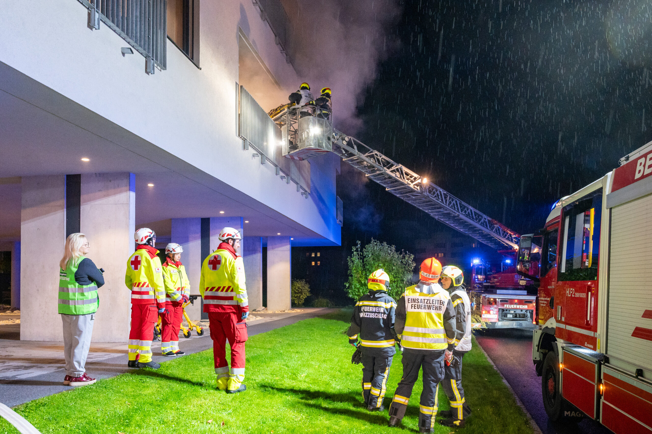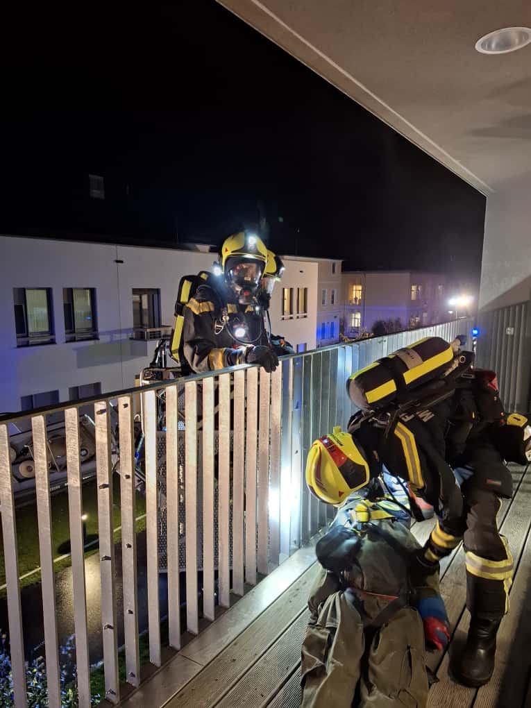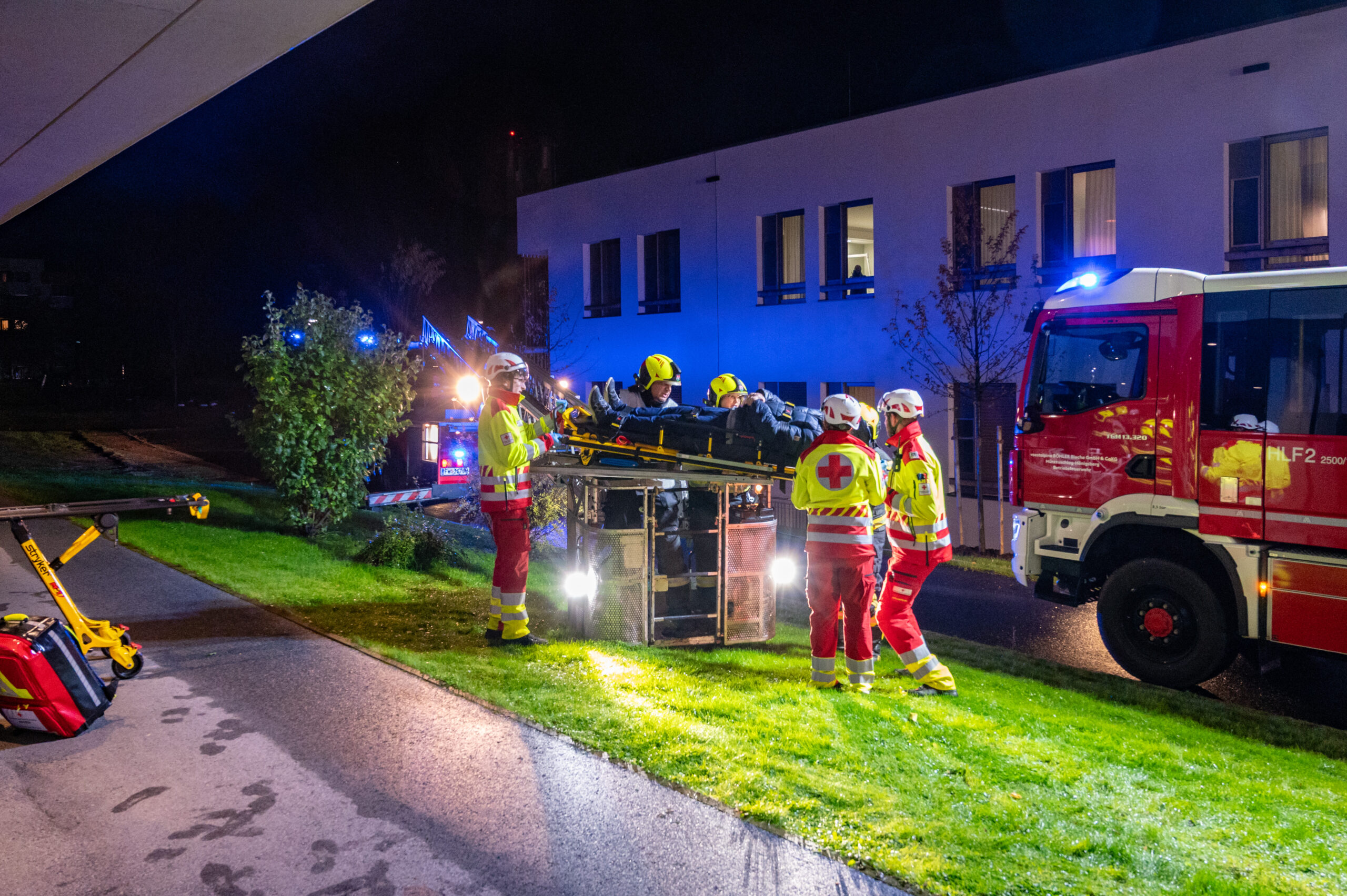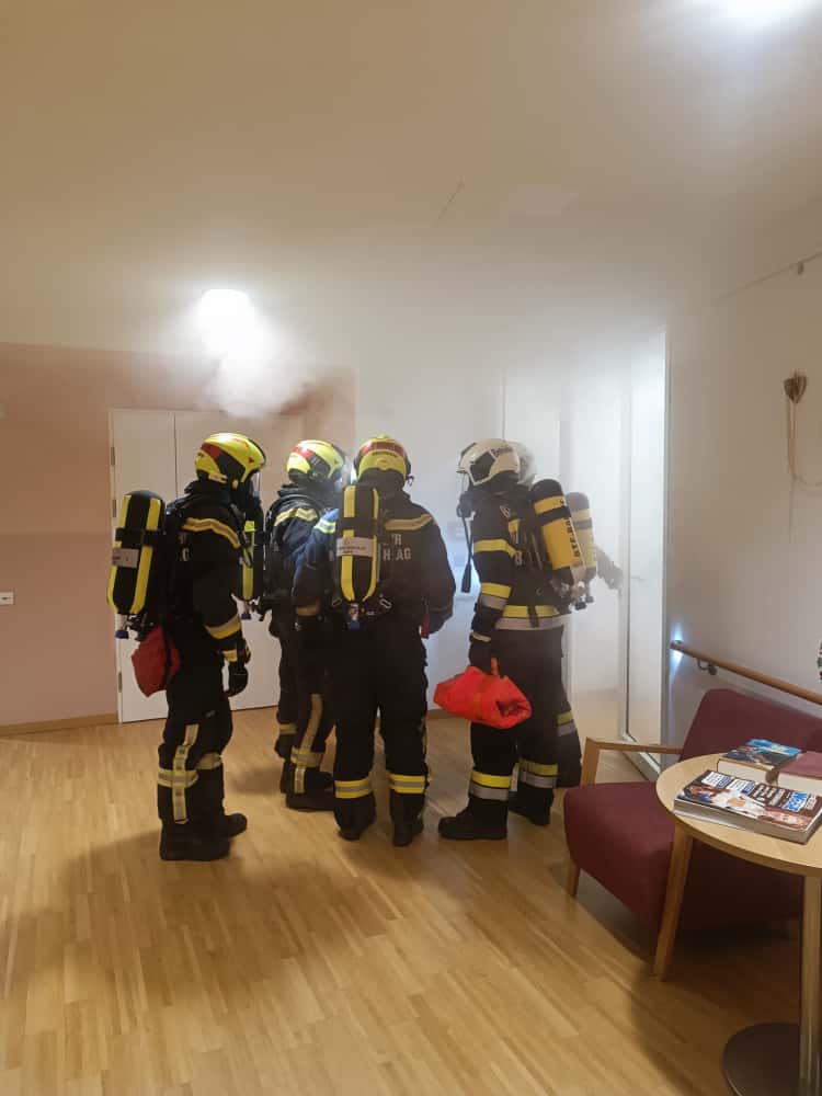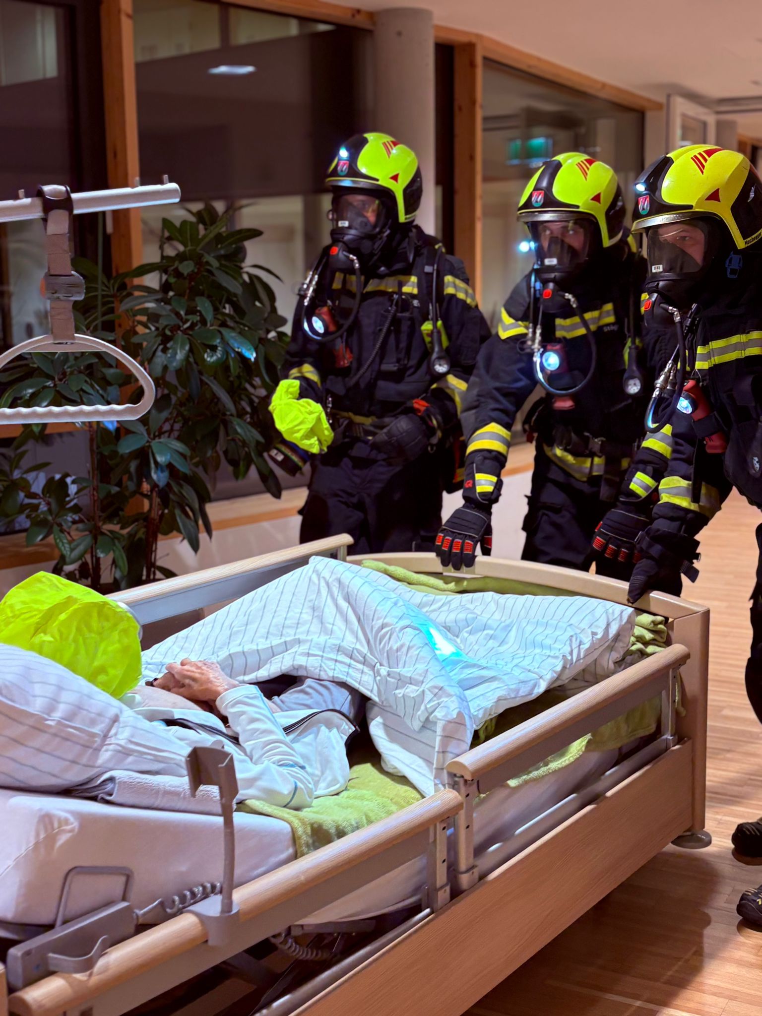 Während ein Atemschutztrupp mittels Fluchthauben betroffene Heimbewohner in Sicherheit brachte, wurde parallel eine Person über die Drehleiter gerettet und die Personensuche fortgesetzt.