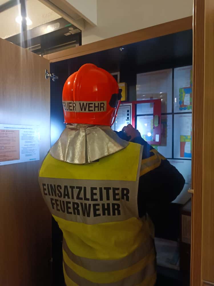 Um 17:10 erfolgte der Übungsalarm durch Auslösung der Brandmeldeanlage, umgehend rückte die Einsatzleitung zum betroffenen Objekt aus. Die Erkundung ergab eine starke Rauchentwicklung im 1. Obergeschoss, wobei sämtliche Zimmer im betroffenen Brandabschnitt belegt und sich auch Besucher im Gebäude befanden.