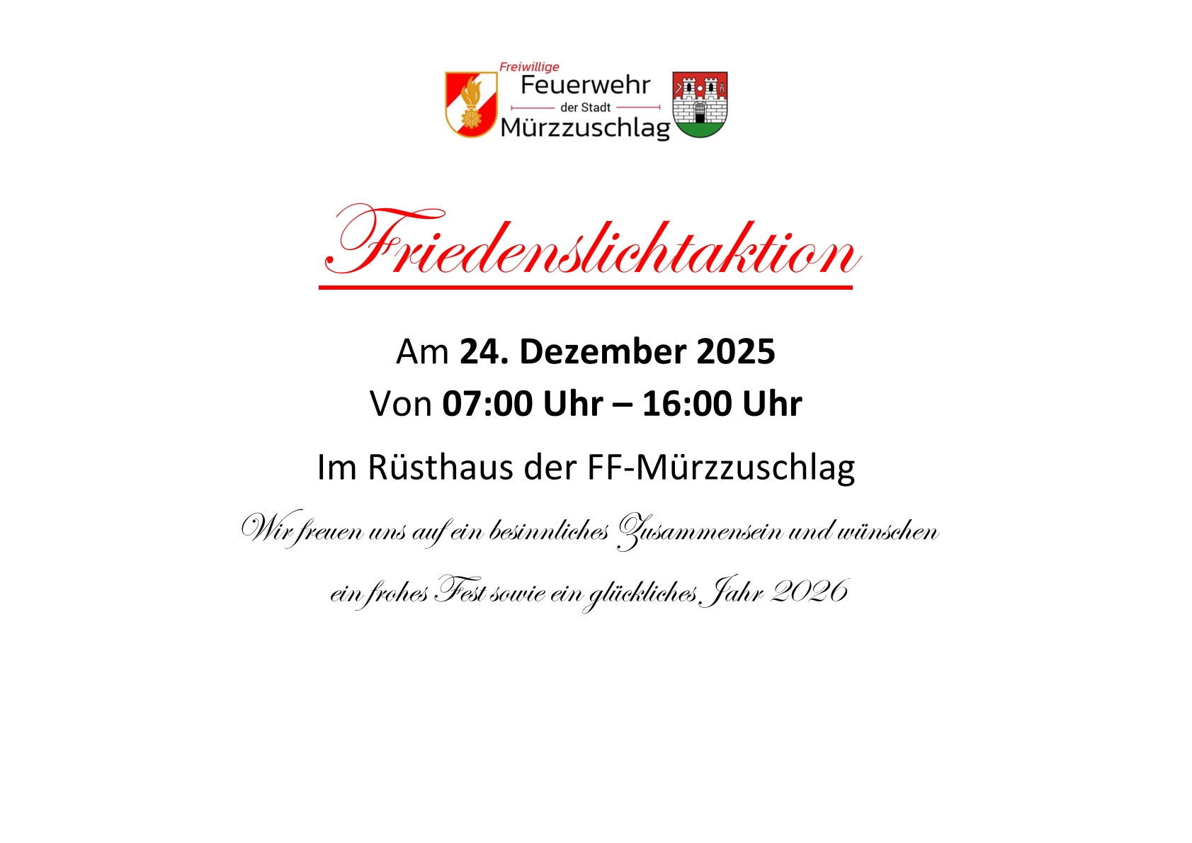 Friedenslicht 2025 Schlagwörter: 2025, Jugend, Sonstiges Auch heuer empfängt unsere Feuerwehrjugend das Friedenslicht aus Bethlehem.Dieses kann am 24. Dezember von 07:00 – 16:00 Uhr im Rüsthaus der Feuerwehr Mürzzuschlag abgeholt werden. Wir freuen uns auf Ihren Besuch Beitrag veröffentlicht:20. Dezember 2025 Beitrags-Kategorie:Jugend Aktivitäten / Sonstiges Weitere Artikel ansehen Vorheriger BeitragNachruf HFM Klaus Rosenbichler