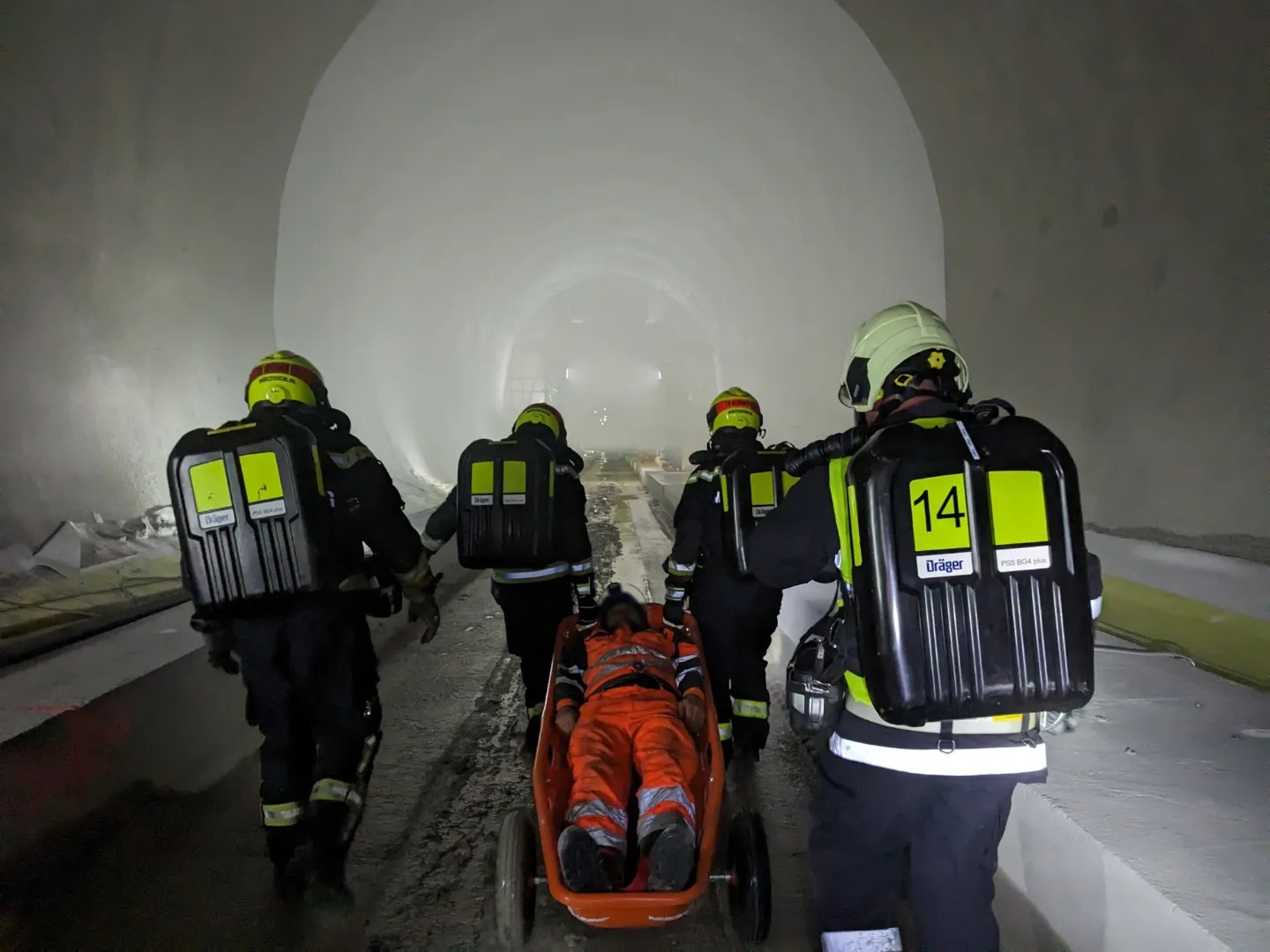 Einsatzszenario war ein Brand in einem Querschlag mit einer vermissten Person. Zwei Trupps der Feuerwehren Spital am Semmering und Mürzzuschlag rüsteten sich mit Sauerstoffkreislaufgeräten aus und fuhren in den Tunnel ein.