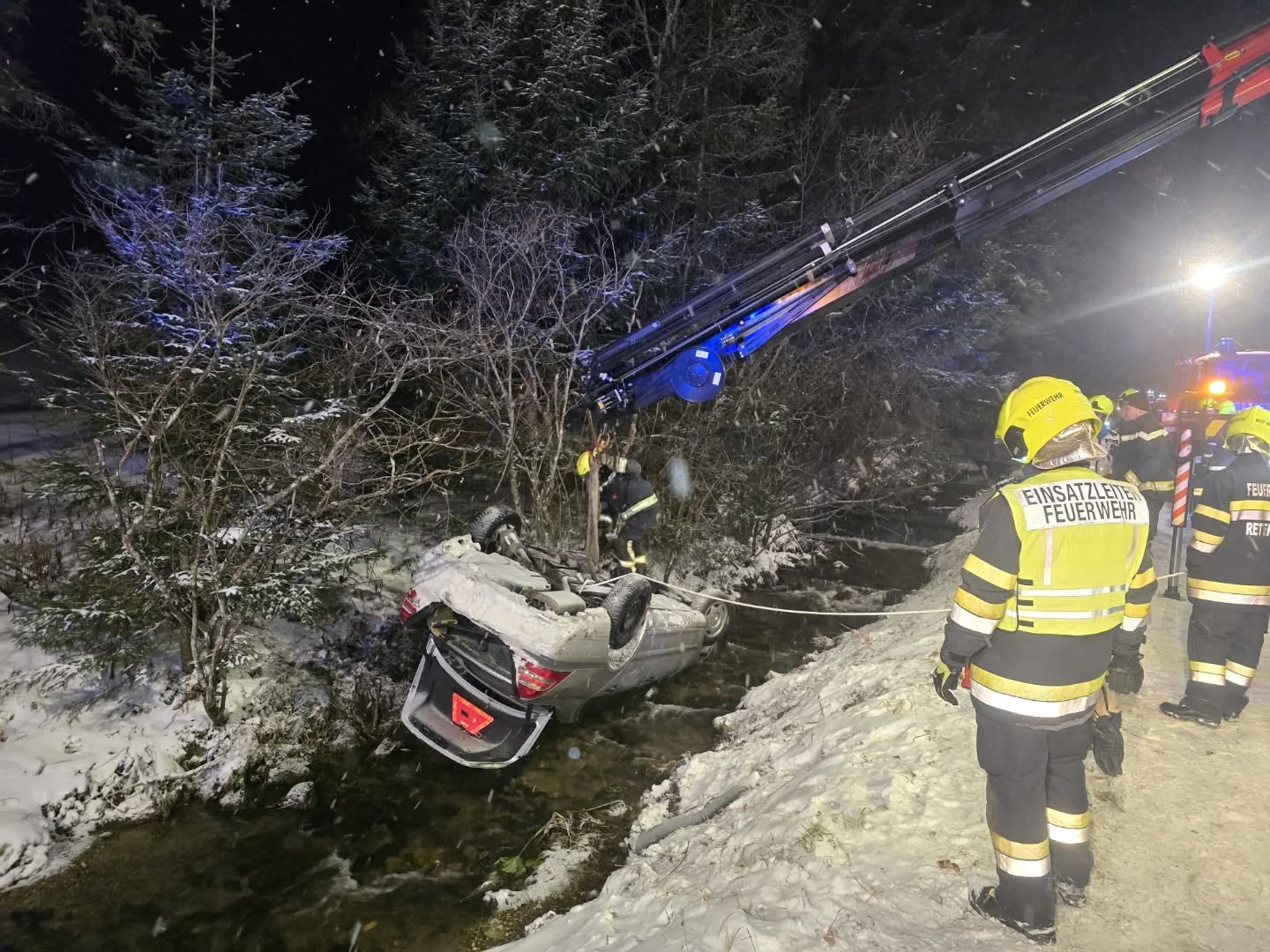 Ein Fahrzeug kam bei schneeglatter Fahrbahn von der Straße ab und blieb am Dach in einem Bach liegen.